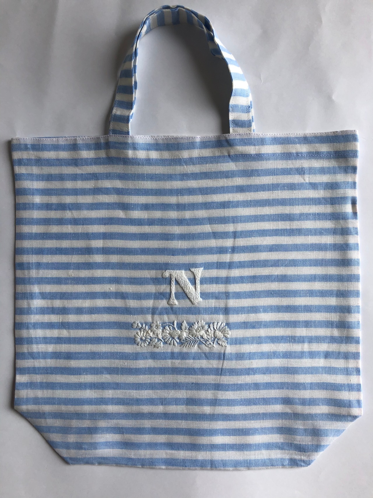 イニシャルトートバックN 麻 水色ストライプ